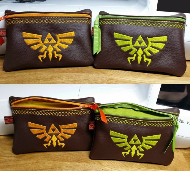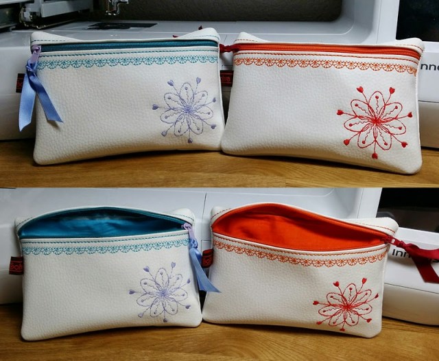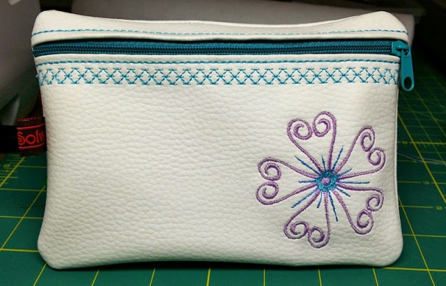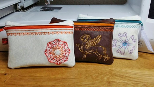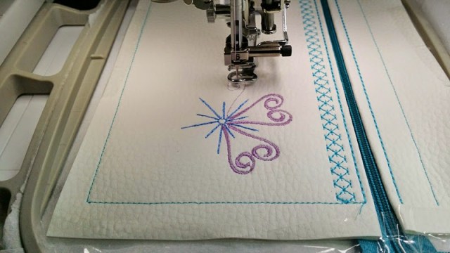 Statt aus Stoff, benutzte ich Kunstleder und probierte verschiedene Stickmotive aus.