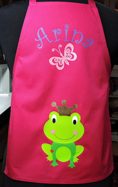 Für ein kleines Mädchen, gab es dieses Weihnachtsgeschenk. Eine pinkige Kinderschürze beplottet mit ihrem Namen und einem Froschkönig.