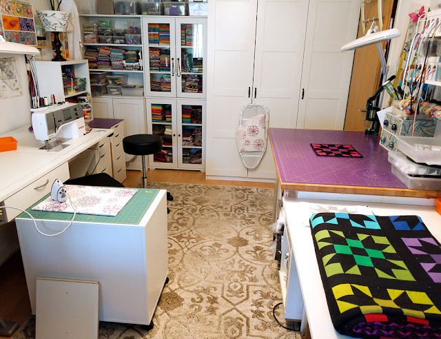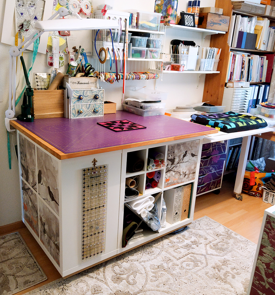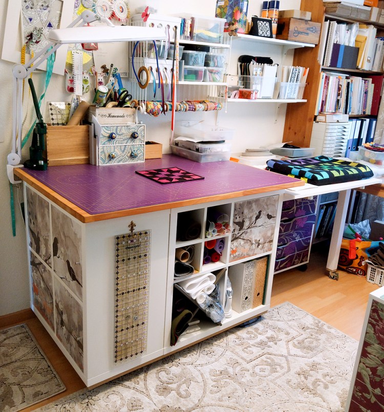 Ein neuer Teppich wurde hinzugefügt, ein Schrank mit mehr Platz und Staumöglichkeiten, Tische verstellt und im November 2017 zog der Nähtisch MULTI von RMF bei mir ein (Bericht hier —>). Die Overlock und die Stickmaschine wurden im Schrank verstaut, da ich sie zur Zeit weniger benutze und mir so mehr freien Platz ermöglicht.