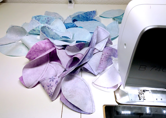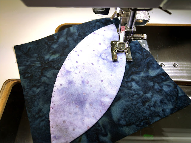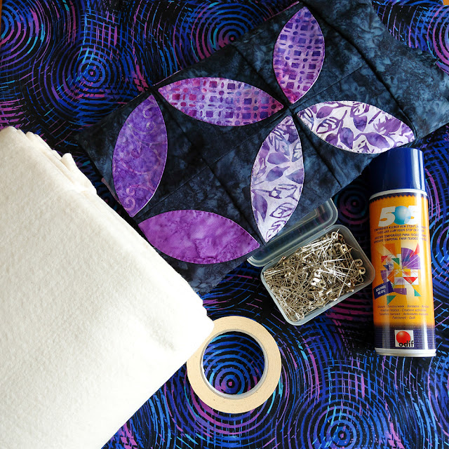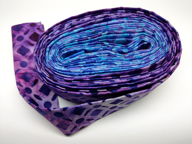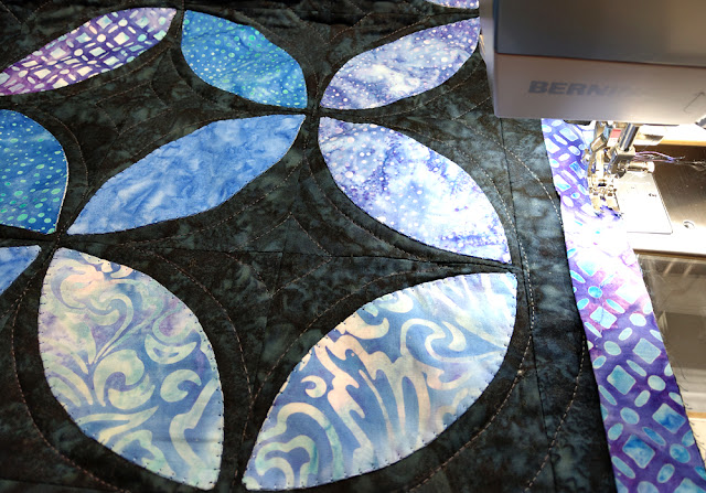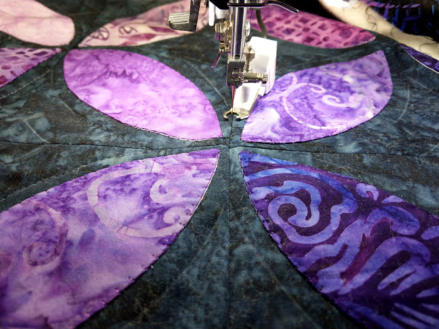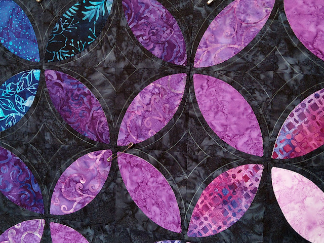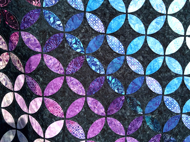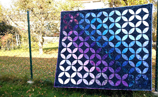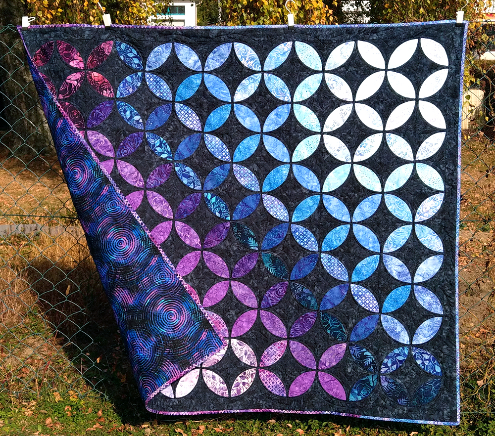 Gequiltet wurde mit dem BSR Fuss und einem dunkelgrauen Garn von Isacord. Das Binding wurde 2-Farbig gemacht, so, dass der blaue Teil zum zu den blauen Peels zeigt und der violette Teil zu den violetten Peels.