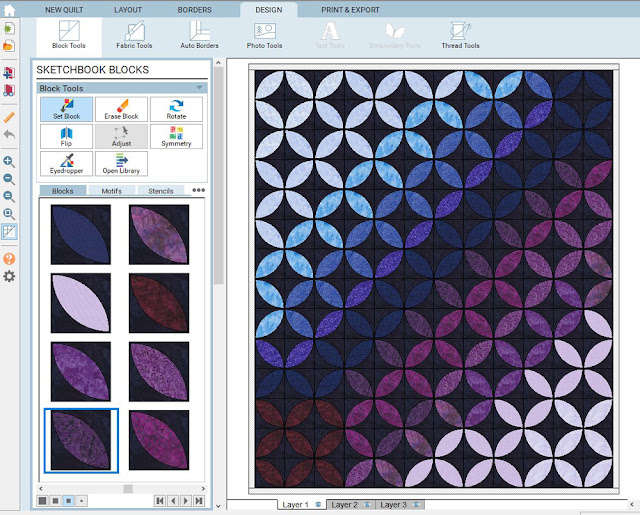Mit Hilfe der Quiltsoftware EQ8, habe ich die Peels so arrangieren können, wie ich sie gerne hätte. Es ist etwas einfacher, als an der Designerwand diese ständig umplatzieren zu müssen.