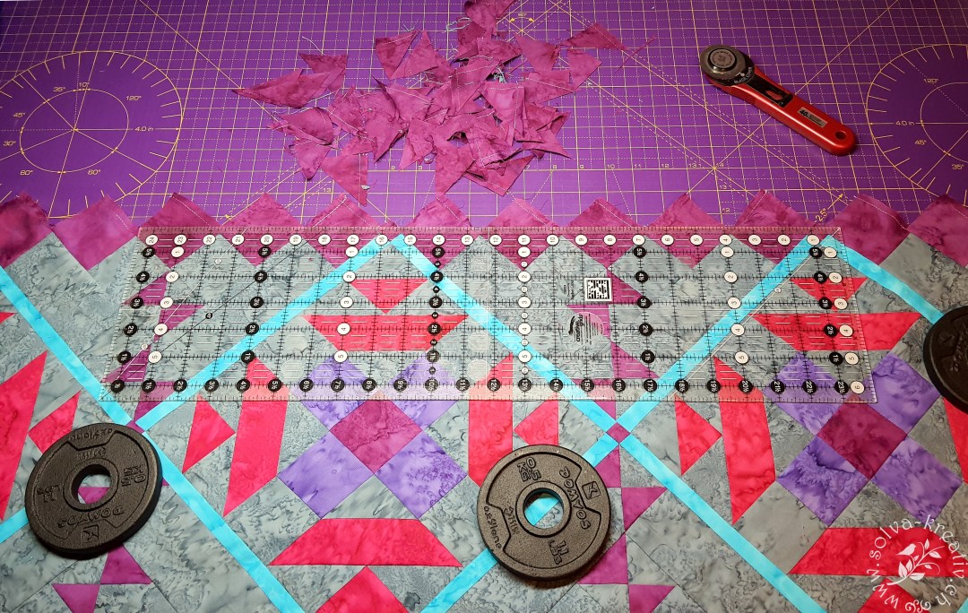 - Beim begradigen des Quilts, nutze ich 500g Hantel-Scheiben. Sie sind klein, schwer und helfen unheimlich gut, um ein Verrutschen zu verhindern.