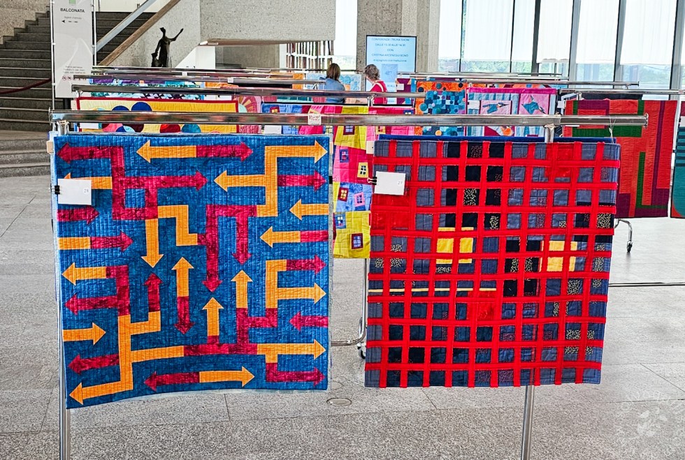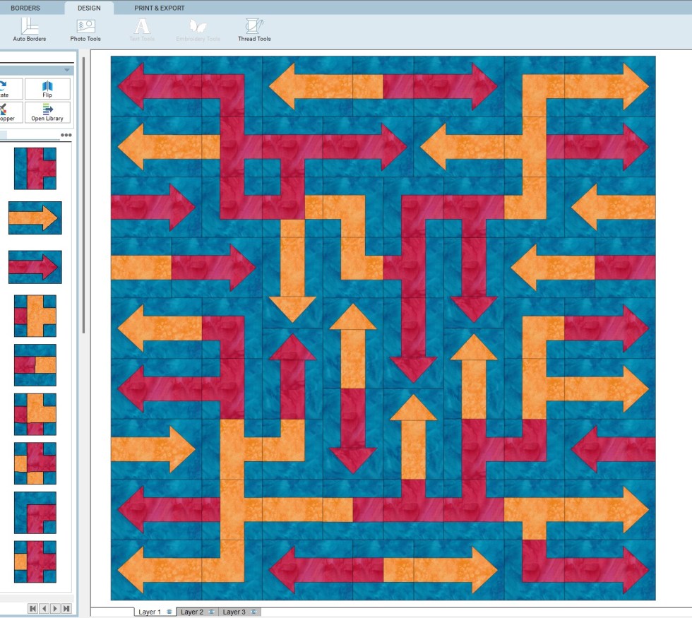 Jetzt kann ich ihn zeigen. Der Challenge Quilt zum Thema Farbenspiel3 von PatCHquilt. Nach der Farbenlehre von Itten, sind 3 äquidistante (den gleichen Abstand aufweisende) Farben auf dem Itten’schen Farbkreis für den Quilt zu verwenden. Meiner heisst Arrows und ist 80x80cm gross. Erstellt habe ich ihn mit dem EQ8 Quilt-Software.