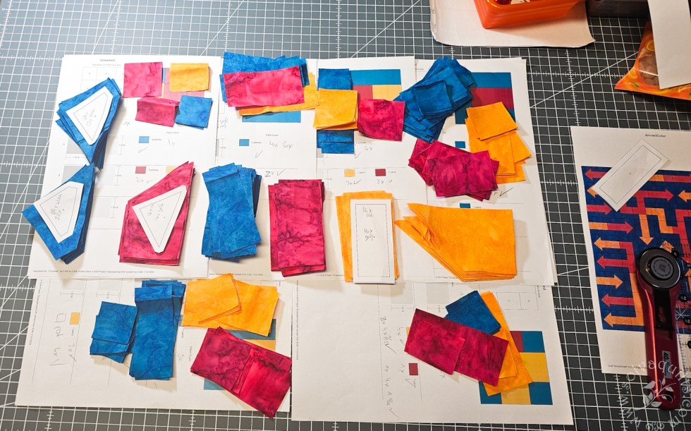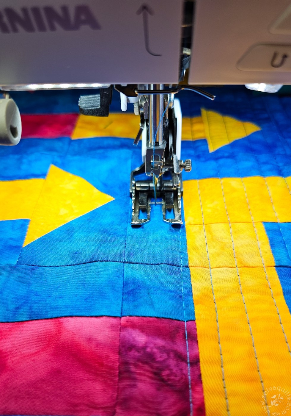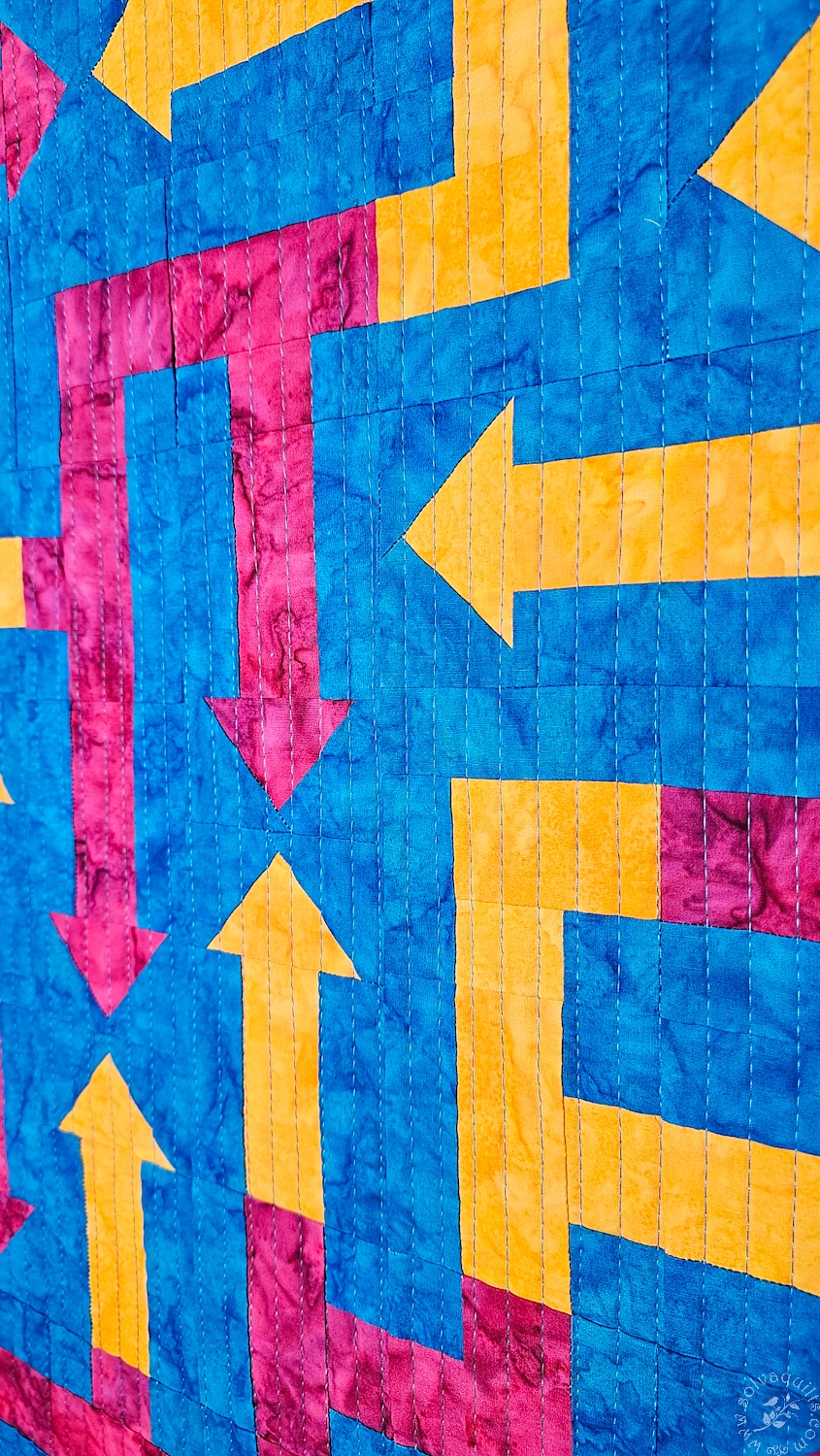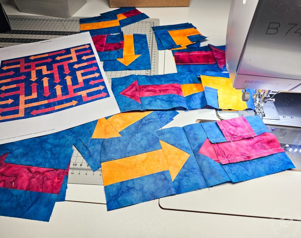 Jetzt kann ich ihn zeigen. Der Challenge Quilt zum Thema Farbenspiel3 von PatCHquilt. Nach der Farbenlehre von Itten, sind 3 äquidistante (den gleichen Abstand aufweisende) Farben auf dem Itten’schen Farbkreis für den Quilt zu verwenden. Meiner heisst Arrows und ist 80x80cm gross. Erstellt habe ich ihn mit dem EQ8 Quilt-Software.